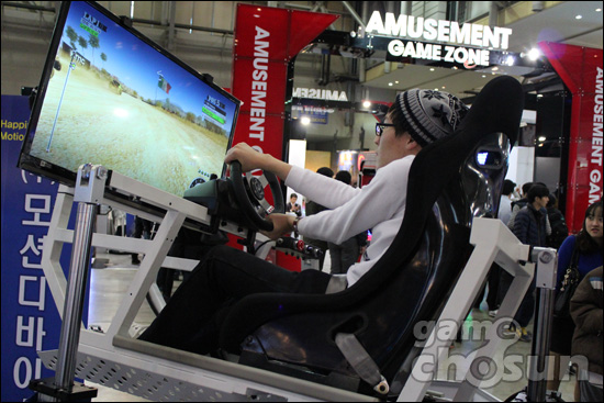 ...'모션디바이스'가 그 주인공이다. 이 회사는 유압장치로 움직이는 체감형 레이싱 스포츠 시뮬레이터 '탑 드리프트'와 비행 스포츠 시뮬레이터 '탑 플라이트'를 선보였다. 관람객들은 코드마스터즈 소프트웨어의 레이싱 게임 '콜린 맥레이:더트2'를 탑 드리프트로 시연했다