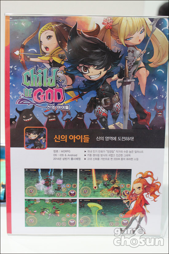 ... 신의 아이들은 시원한 액션과 통쾌한 타격감이 일품인 액션 게임으로, 게임을 즐긴 관람객들은 "피쳐폰 시절 즐기던 액션 게임 같다", "자동 전투가 주를 이루는 현재 모바일 게임 사이에서 단연 눈에 띈다"는 등의 반응을 보였다. 또, 신의 아이들은 신암행어사와 아일랜드 등으로