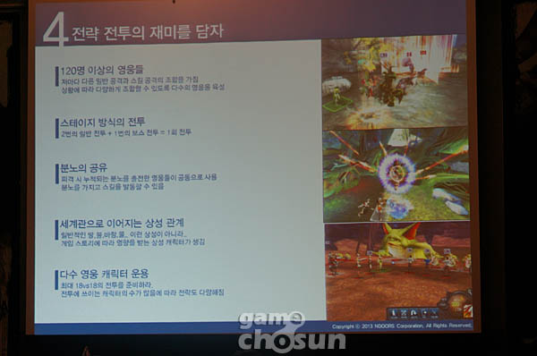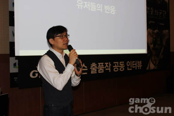 ... ▲ 영웅의군단에 대해 소개하고 있는 김태곤 엔도어즈 게임 총괄PD이를 위해 게이머가 하나의 세계에 자신이 존재한다는 느낌을 구현하고 방대한 시나리오와 퀘스트를 통해 게임을 플레이해야하는 동기부여를 제공한다. 또한 다른 유저들과 커뮤니케이션을 위해 채팅이 가능하고 접속한 친구나