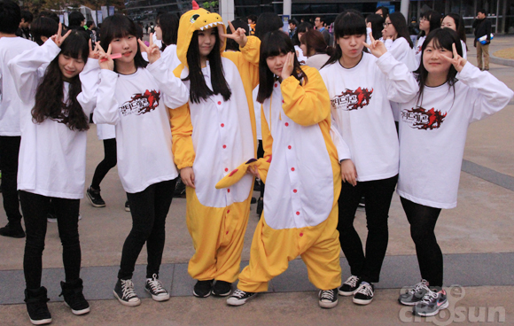... 14일 오후 4시 부산 벡스코 야외무대에서 진행된 플래시몹은 흰색 긴 팔 티와 검은색 바지를 입은 80명의 남녀가 'WHAT DOES THE 용 SAY?'라는 곡에 맞춰 춤을 추며 진행됐다. 이번 행사에 참여한 최 모양(21)은 "게임 관련 학과에 진학중인 학생으로써 최근