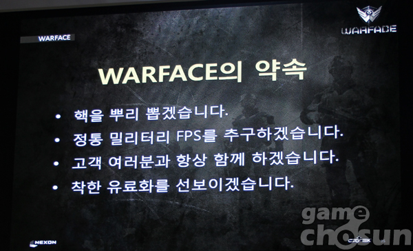 ... ▲ 웜 코벨리어스 개발팀장이 설명한 워페이스의 네 가지 특징 또한 게임 콘텐츠 설명으로 PvE모드에서는 친구와 협력하여 미션을 해결해 나가고 병과 별로 역할이 주어져서 메딕의 치료, 엔지니어의 활동 등 협동 플레이를 부각시켰다. 그리고 남미, 발칸반도, 중동 등의