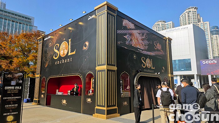 ... 내부 공간은 부스 다섯 면을 스크린으로 활용해 마치 게임 속에 들어온 듯한 분위기를 연출했다. 게이머는 중앙에 놓인 태블릿을 조작해 시네마틱 영상을 감상하고, 솔: 인챈트의 게임 콘셉트인 '신권'을 느껴볼 수 있다. 한편 솔 인챈트는 2
