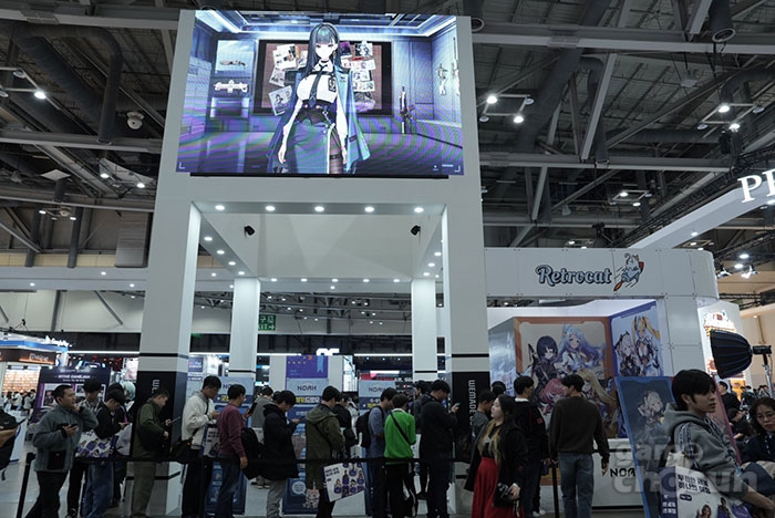 ... 키 비주얼과 캐릭터 아트워크를 부스 곳곳에 배치해 작품의 정체성을 강조했으며, 8m 높이의 구조물에는 게임 PV 영상을 상영하는 모니터와 캐릭터 등신대, 모바일 디바이스 등을 설치해 시선을 끌었다. 시연용 데모 버전은 약 10분 분량으로, 기본 세계관과 주요 스토리