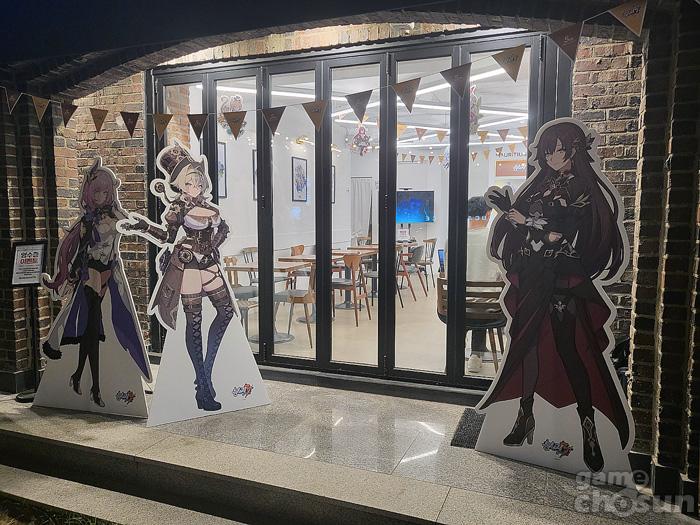 ... 필자가 방문했을 땐 매장의 마감 시간을 얼마 남겨두지 않아 줄을 설 필요가 없었다 = 게임조선 촬영 입구에 세워져 있는 '불을 쫓는 나방'의 융합전사 엘리시아, 빌브이, 에덴의 등신대 스탠드= 게임조선 촬영 인게임 챕터 29장부터 31장까