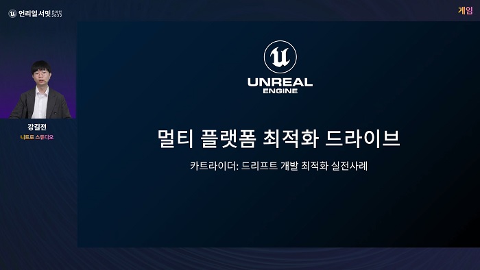 ... 강길전 프로그래머는 "카트라이더: 드리프트 개발팀에 속해 7년 동안 언리얼 엔진을 사용해왔으며, 주요 작업은 주행 물,리 동기화, 게임 프레임워크 설계 등 게임 전반에 걸친 개발을 담당했다"라고 자신을 소개했으며 "최적화 작업 전반을 맡고 있다&q