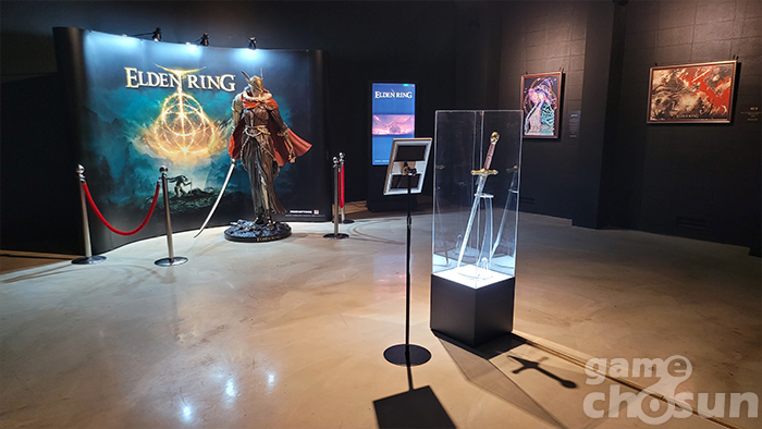 ... 전시장에 들어가기 전 각종 게임 툴팁이나 아트북, 스태추 등을 볼 수 있었다. = 게임조선 촬영 본 전시장에는 말레니아 스태추를 중심으로 양쪽으로 일러스트와 콘셉트 아트를 감상할 수 있게 구성됐다. = 게임조선 촬영 전시에는 엘든 링의 콘셉트 아트와 콜