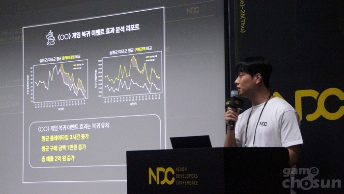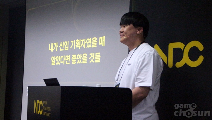 ... 발표를 위해 나선 넥슨코리아 김영준 기획자는 게임을 단순히 많이 플레이하는 것보다는 항상 "왜?"라는 질문과 함께하는 기획자처럼 게임을 플레이하는 마인드 탑재의 중요성을 강조했다. 가령 게임을 종료해도 자동 사냥을 하며