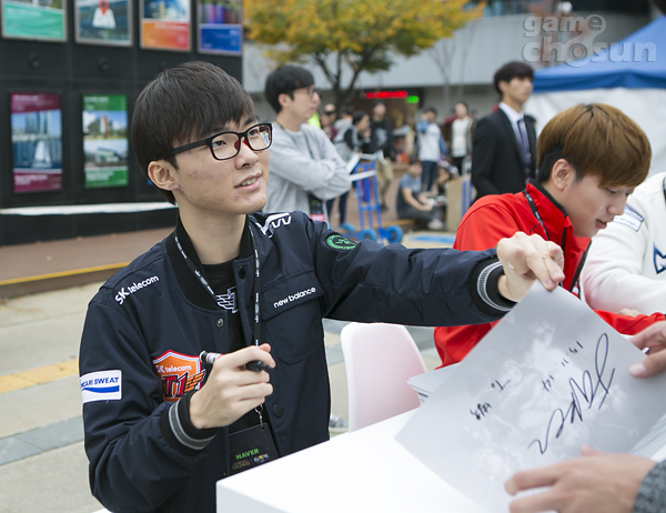 ...오후 2시부터 진행된 이번 사인회에는 '페이커' 이상혁, '스코어' 고동빈, '퓨리' 이진용, '캡틴잭' 강형우, '와치' 조재걸이 참석해 지스타 팬들과 만나는 시간을 가졌다. 부스를 찾은 많은 팬들은 직접 만나기 힘든 선수들에게 사인을 받고 간단한 이야기도 나누는 등 즐거운 시간