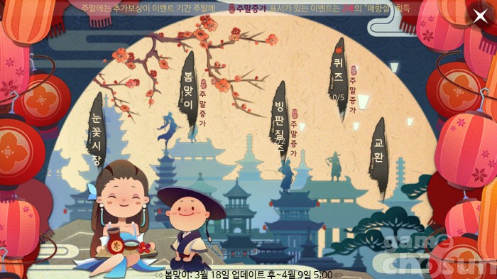 ... 각 퀘스트를 완료하면 활동 내역에 따라 보상 상자를 지급하며, 이용자는 이 상자에서 각종 아이템과 함께 일정 확률로 이벤트 상점 '눈꽃시장' 교환 아이템인 '매향설'을 얻을 수 있다. 또한 이벤트 퀘스트를 주말에 완료할 경우 추가 보상을 받을 수 있다. 이벤트