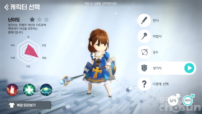 ... ◆ 성기사의 특징 성기사 캐릭터 생성 화면 = 게임조선 촬영 성기사는 기초 능력치에서는 체질이 매우 높은 수준으로 초기값이 책정되어 있으며 뒤이어 힘>민첩=지혜>지능=매력 순으로 능력치가 배분되어 있는데 이를 통해 유추할 수 있듯이최전방에서 적의 공