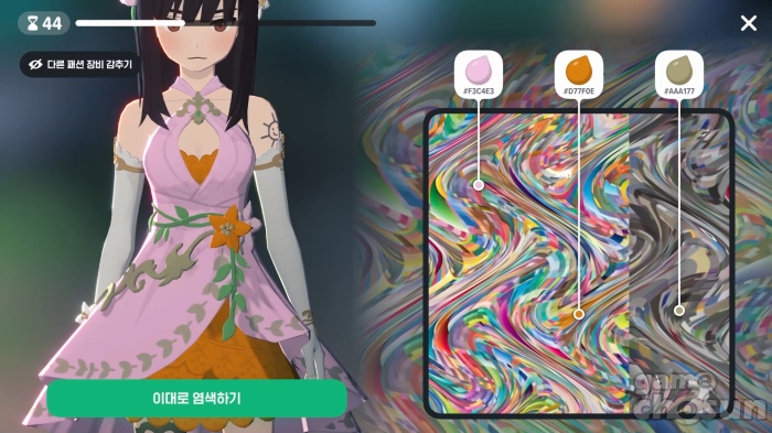 ... 염색약 사용 후 원하는 의상을 고르면 무작위로 제시되는 색을 골라 의상을 염색할 수 있다. 의상은 여러 염색 그룹으로 나누어져 있으며, 염색 그룹은 다시 몇 가지 염색 파트로 구성됐다. 상의가 2가지 염색 그룹 중 하나를 골라 3가지 파트를 염색하고, 다리는 1가