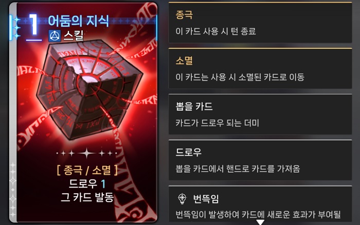 ... 전략적인 플레이를 위해서는 카드에 등장하는 주요 용어를 숙지하고 있어야 하는데, 덱빌딩 기반 카드 게임에 익숙하지 않은 이용자라면 생소한 용어와 진행 방식에 어려움을 겪을 수 있다. 이에 게임조선에서는 이용자들의 이해를 돕고자, 카드에 등장하는 주요 조