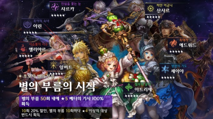 ... 별이되어라2에 등장하는 플레이어블 캐릭터는 5성 등급 9종과 4성 등급 11종, 총 20종이다. 메인 스토리와 이벤트 보상으로 얻는 일부 4성 캐릭터를 제외하고는 일반적으로 소환을 통해 캐릭터를 획득하게 된다. 즉 기본적인 능력치와 높은 스킬 효율을 지닌 5성 등급의 캐