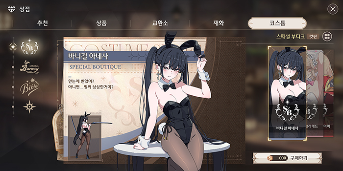 ... 해당 코스튬은 스킬 컷신 연출이 바뀌지 않는 일반 코스튬으로, 코스튬 구매 시 코스튬 전용 에피소드를 감상할 수 있습니다. 또한, '코스튬' 상점이 새롭게 추가됩니다. 기존에 출시됐던 다양한 코스튬을 콘셉트 별로 모