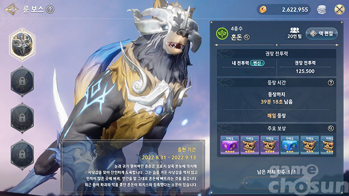 ... 첫 레이드 보스인 '혼돈'은 땅 속성 보스로 권장 전투력은 125,500이다. 보상으론 '의상 교환권 조각 상자'와 '장신구 상자', '장신구 재료 상자'를 얻을 수 있다. 룬 보스 레이드에서 눈여겨볼 보상은 바로