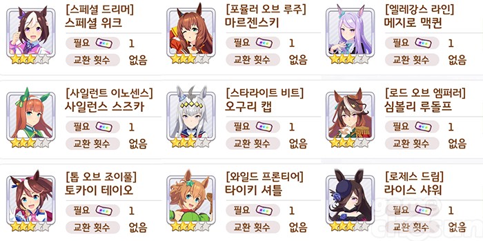 ... 육성 시 이벤트 스토리 주인공인 '스페셜 위크'와 '사일런스 스즈카', '토카이 테이오' 관련 카드,신규 캐릭터 '티엠 오페라 오', 신규 서포트 카드 '스윕 토쇼' 카드를 쓰면 추가 이벤트 포인트를 얻을 수