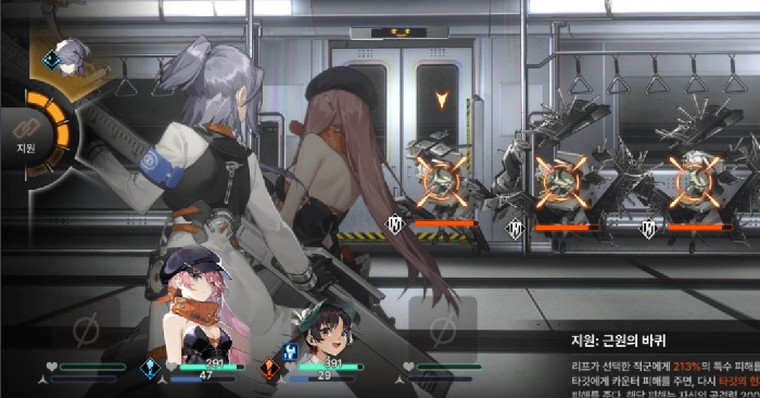 ... 팀장 측의 유닛(요원)들과 적측 유닛들이 일련의 행동을 지정하고 턴을 종료하면 개별 유닛의 행동 속도에 따라 순차적으로 행동을 주고 받으며1턴에 1회 행동이 무조건 보장되는 방식이다. 각 요원의 스킬셋은 다음과 같은 구조로 이뤄진다 - 일반 공격 : 1
