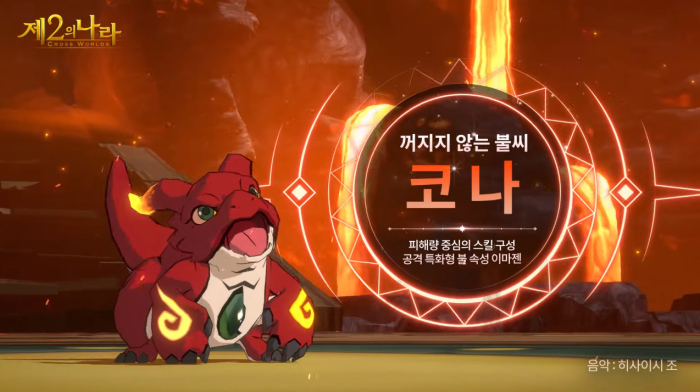 ... 공식 유튜브 채널을 통해 공개된 영상에는 코나의 동행용 액티브 스킬 '불의 정수'와 결투장용 스킬 '불의 의지'의 효과 및 사용 모션이 담겨있다. 또한 일반 필드부터 결투장까지 상황에 따라서 어떻게 코나를 사용해야 하는지, 어떤 이마젠과 추천하