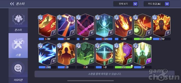 ... 몬스터가 사망할 경우에 해당 몬스터의 액티브 스킬을 사용할 수 없는 것에 반해서, 스펠 카드는 이용자의 핸드에 드로우된 상태에서마나 코스트만 충분히 있다면 언제든 사용할 수 있다는 특징을 가지고 있다. 또한 스펠 카드는 몬스터 카드의 액티브 스킬보다는 좀 더 자유롭게