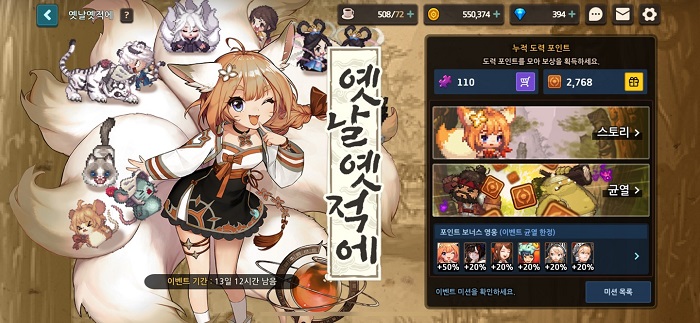 ... 특히 우리나라의 과거부터 전해내려오는 전래 동화를 연상시키는 것이 가장 큰 특징. 옛날옛적에 라이브 이벤트는 총 5개의 스테이지로 구성돼 있으며, 9월 2일부터는 높은 난이도의 챌린지 모드가 오픈될 예정이다. 또, 이벤트 균열을 통해 다양한 보상을 받을 수 있으며 이벤트