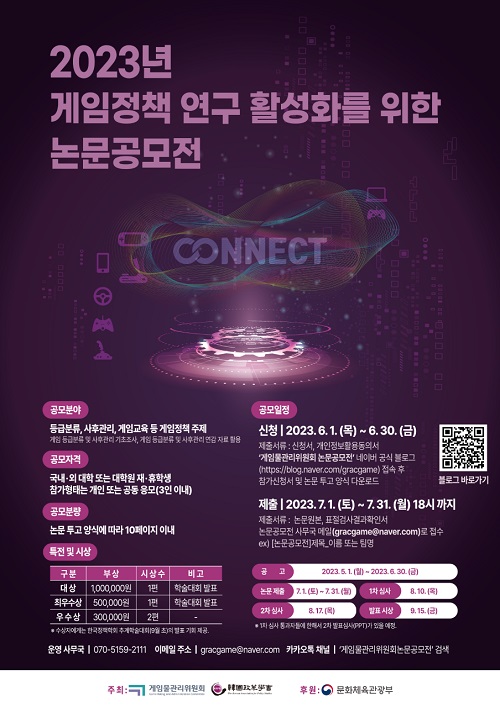 ... 이번 논문 공모전을 준비한 게임위 김규철 위원장은 “게임정책 논문공모전을 통해 게임정책 연구가 확산되어 합리적이고 혁신적인 정책 연구 활동이 활성화 되는 계기가 될 것으로 기대한다”라고 밝혔다. 논문에 대한 심사는 한국정책학회를 통해 진행되며,