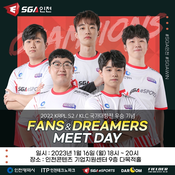 ... 이번 ‘Fans & Dreamers Meet Day’ 행사는 인천테크노파크의 지원으로 인천 부평구에 위치한 인천콘텐츠기업지원센터 다목적홀에 선수단을 초청하여 우승을 차지하기까지의 과정과 프로게이머가 갖춰야 할 소양에 대해서 선수단과 감독의 실질적
