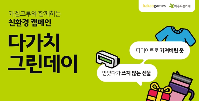 ... 이렇게 모인 기부 물품은 비영리 공익재단 ‘아름다운가게’로 전달, 판매될 예정이며, 수익금은 국내외 소외계층 이웃을 돕는데 쓰이게 된다. 카카오게임즈 관계자는 “올해 친환경 부문에서 임직원들이 즐겁게 동참할 수 있는 ‘다가치 그린