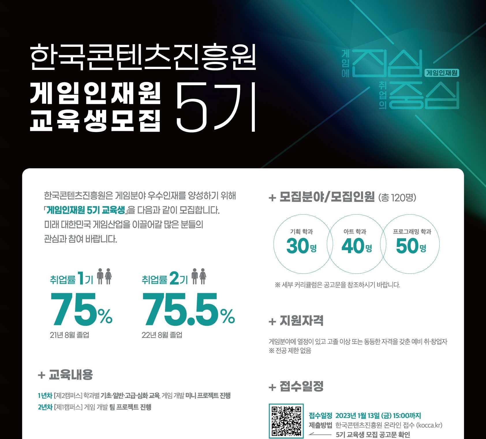 ...5%에 달한다. 대·중견기업에는 취업생 중 35%가 진출하면서 게임산업 핵심인재 양성의 주목할 만한 성과를 보이고 있다. ◆ 5기 교육생 120명 확대 모집
