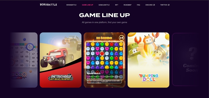 ... 보라배틀의 브랜드 사이트는 기본적으로 보라배틀의 간단한 설명과 함께 보라배틀 플랫폼에서 즐길 수 있는 게임들을 소개하고 있다. 원터치 컨트롤로 코너링과 부스트를 즐길 수 있는 오프로드 레이싱 게임 ‘원터치레이서(One Touch Racer)’,