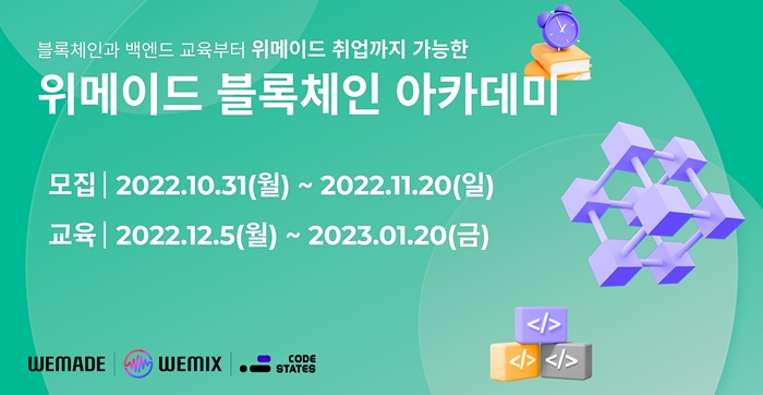 ... 커리큘럼은 실습 중심의 백엔드 과정(3주)과 월렛, 스마트컨트랙트, NFT 이론 및 실습 등을 포함한 블록체인 과정(4주)으로 구성된다. 교육비는 위메이드가 전액 지원한다. 우수 수료자는 위메이드에 입사할 수 있는 기회를 받는다