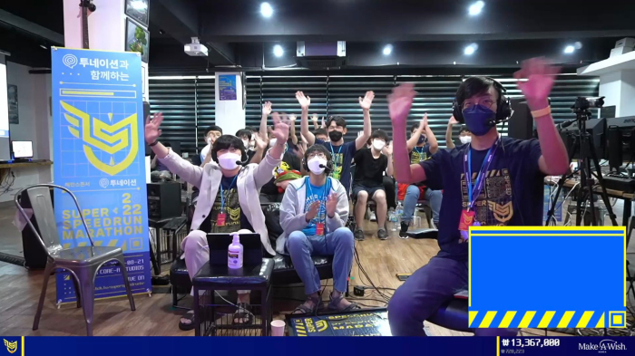 ... 모금 대상 NGO 파트너는 국제 비영리단체 메이크어위시 코리아로 연간 300명 내외의 난치병 아동들의 소원을 이뤄주고 있다. 특히 올해는 신촌 코어에이 스튜디오에서 작년에 하지 못했던 일반 관객도 받는 오프라인 이벤트로 개최하여 많은 관객들이 4일간 스피드런을 현장에서 직