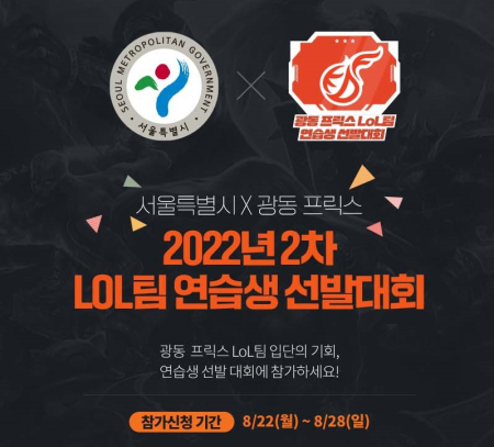 ... 이번연습생선발대회는팀단위신청만가능하며,참가신청팀중현시즌최고티어평균을기준으로상위8팀을선발해진행한다. 대회본선은오는9월3일(토)부터15일(목)까지더블엘리미네이션3판2선승제,결승전은9월17일(토)에싱글토너먼트5판3선승제로진행된다. 본선은온라인,결승전은서울e스타디움에