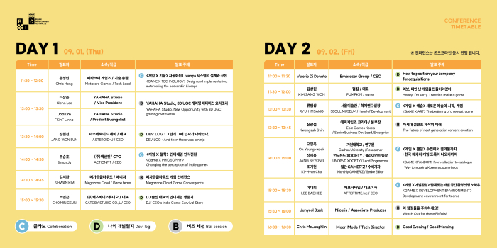 ... 각 카테고리는 인디게임 개발 과정에 대한 진솔한 경험담, 다양한 분야의 시각에서 바라보는 인디게임, 인디게임 활용 플랫폼과 같은 다양한 주제로 진행될 예정이다. 올해 BIC 컨퍼런스는 1일 차에는 메타코어 게임즈의 홍성민 기술 총괄, YAHAHA Studio의 이상준 Vi