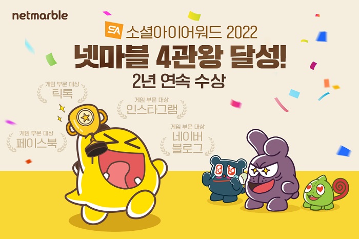 ... 넷마블은 2015년 게임업계 최초 ‘대한민국 블로그 어워드’ 대상 수상을 시작으로 뉴미디어 활동을 꾸준히 인정받고 있다. 올해 ‘소셜아이어워드’ 외에도 5년 연속으로 ‘디지털고객만족도’에서 게임부문 1위와 S