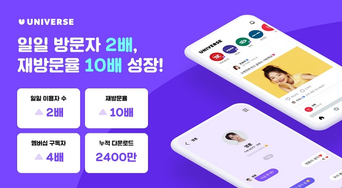 ... 향상된 사용성을 바탕으로 일일 방문자는 2배, 재방문율은 10배 증가했다. 글로벌 누적 다운로드는 2,400만을 돌파했다. 유니버스의 핵심 서비스인 ‘프라이빗 메시지(Private Message)’의 멤버십 구독자 수도 4배 증가했다