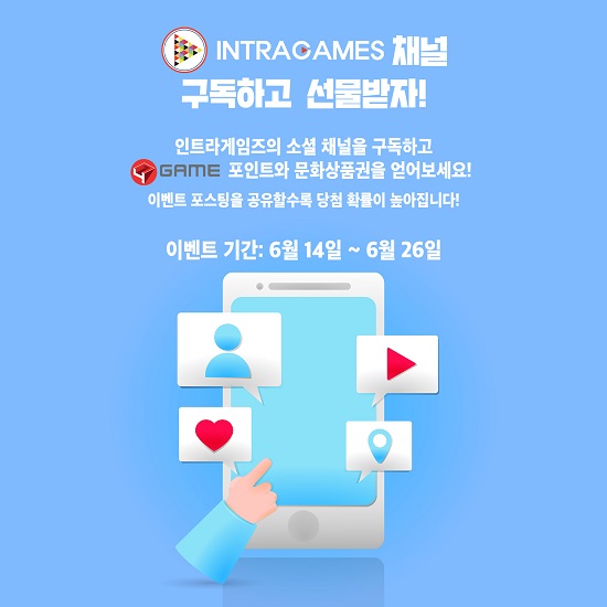 ... 이벤트 기간은 6월 14일부터 6월 26일까지이며, 인트라게임즈의 공식 트위터와 페이스북, 유튜브 채널을 구독한 후 양식에 맞게 인증하면 자동 응모된다. 이벤트는 1인 1회만 응모할 수 있다. 응모한 구독자들에게는 인트라게임즈의 ESD 사이트 ‘포게임