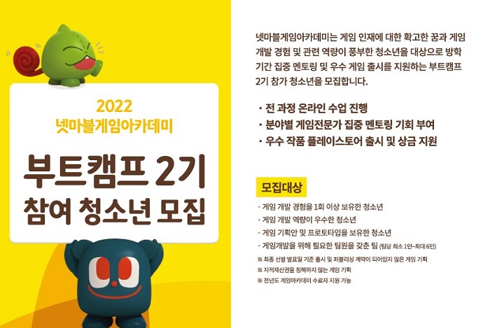 ... 오프라인을 기반으로 8개월 간 게임 개발에 대한 범용적인 교육과정을 제공하는 기존 게임아카데미와 달리 부트캠프는 방학기간 약 2개월 동안 한층 심화된 실무 개발 훈련을 온라인으로 진행하는 것이 특징이다. 부트캠프는 게임 개발 경험이 있거나 참신한 게임 기획 및 개발