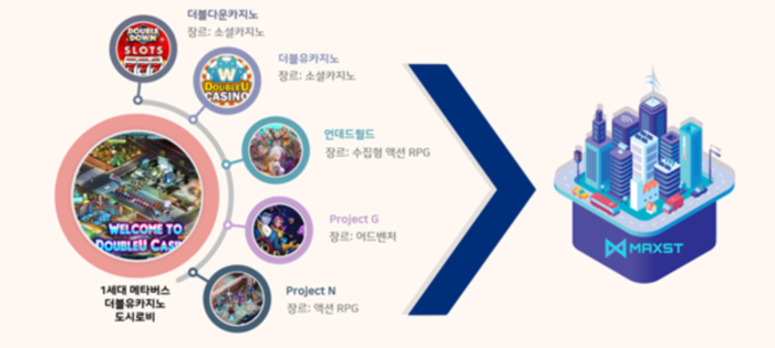 ... 더블유게임즈가 서비스하고 있고 개발 중인 소셜카지노와 캐주얼 게임 등에 맥스트가 보유한 메타버스 기술을 접목하기로 합의하였으며, 이를 바탕으로 추가적인 성장동력을 얻을 수 있을 것으로 평가된다. 더블다운카지노(소셜카지노), 더블유카지노(소셜카지노), 언데드월드(수집형 액션