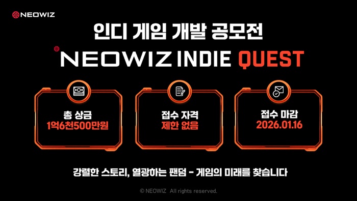 ... 별도의 퍼블리싱 계약 조건 없이 창작자가 순수한 개발 활동에만 집중할 수 있도록 한 것이 특징이다. 약 9개월 간 운영된 해당 공모전은 오는 1월 16일 접수 마감을 앞두고 공식 홈페이지를 개편했다. 공모전 상세 안내를 강화하고, ‘네오위즈 인디 게임&rsqu