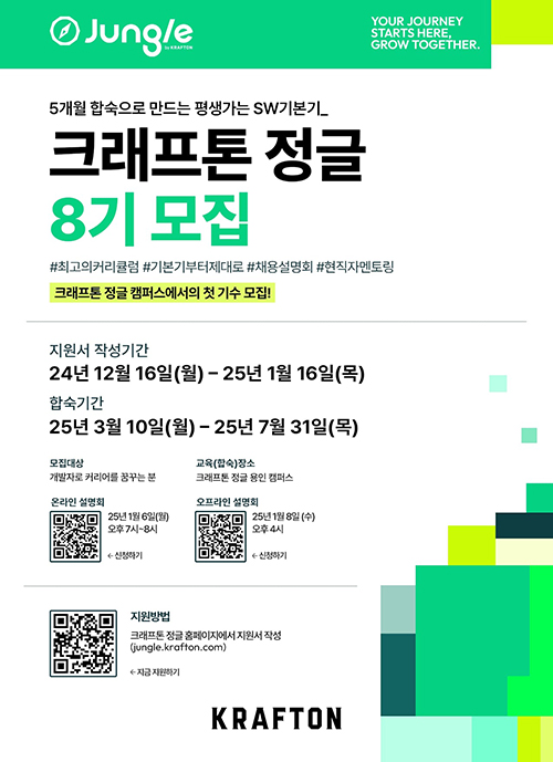 ... 개발자로의 진로를 희망하는 사람은 전공이나 경력과 관계없이 지원이 가능하다. 전형 절차는 서류접수, 입학시험, 인터뷰 순이며, 입학시험 준비를 위한 사전 학습 자료도 별도로 제공한다. 최종 합격자는 2025년 3월부터 7월까지 경기도 용인에 위치한 크래프톤 정글 캠퍼스에서 합