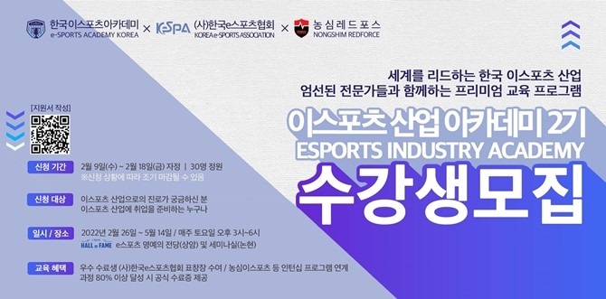 ... 이스포츠 산업 아카데미 2기는 이스포츠 산업에 관심이 높고 관련 직군으로 이직 혹은 취업을 준비하는 이들을 위한 전문 교육 프로그램이다. 본 교육과정에서는 ▲프로게임단 ▲이스포츠 리그 운영사 ▲미디어 ▲이스포츠 교육 및 육성 ▲이스포츠 전용 상품 개발 등 이스포츠 산업 내