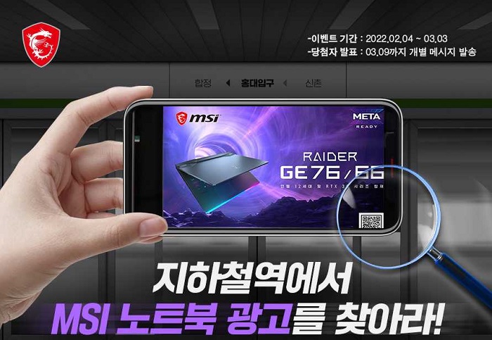 ... 자세한 광고 위치는 이벤트 이미지를 통해 확인할 수 있다. 이벤트 참여 방법은 MSI 노트북 지하철 광고 인증샷을 촬영하고, 페이스북 혹은 인스타그램에 필수 해시태그(#MSI, #노트북, #게이밍노트북, #인텔12세대) 4개를 포함하여 인증샷을 업로드하면 된다. 당첨자는