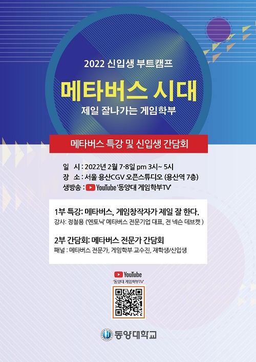 ... 이번 특강에는 메타버스 전문기업인 엔토닉 정철용 대표가 ‘메타버스 시대, 게임창작자가 제일 잘 한다‘라는 주제로 기조 강연을 진행한다. 정철용 엔토닉 대표는 전 넥슨 데브캣 스튜디오 영상 및 그래픽아티스트 출신으로 CG, 3D 동영상, VR 콘텐츠를