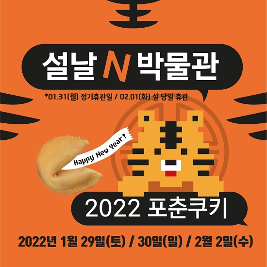... 또한 이벤트 기간 동안 SNS에 인증샷 공유 시 호랑이 저금통, 호랑이 스트레스볼 인형, 호랑이 양말 등 임인년 맞이 소정의 선물을 한정 수량으로 제공할 예정이다. ‘설날N박물관’은 오는 29일(토), 30일(일), 2월 2일(수) 3일간 오전 10시