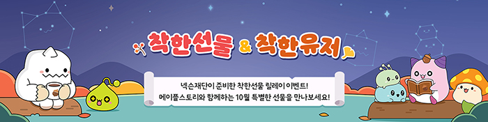 ... 10월 착한선물 & 착한유저 릴레이 이벤트에서는 ‘도토리하우스’에 축하와 응원의 마음을 전하는 착한 유저에게 13년간의 간병 기록을 담은 ‘그날은 그렇게 왔다’ 도서와 메이플스토리 인형 1종을 선물한다. 또한, 오는 11월