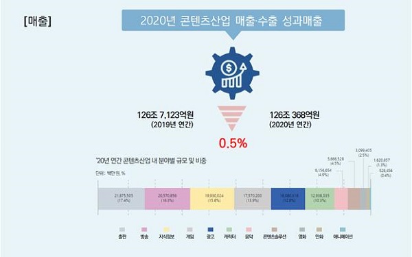 ...1% 증가 2020년 국내 콘텐츠산업의 연간 매출액은 전년 대비 0. 5% 감소한 126조로 집계됐다. 콘텐츠산업은 그간 연이은 성장을 이어왔으나, 코로나19 여파로 지난 2008년 글로벌 금융위기로 인해 전년 대비 1