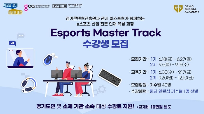 ...G Global Academy)와 경기콘텐츠진흥원은 이스포츠 산업 전문 실무자 양성을 위한 직업 교육 프로그램인 ‘이스포츠 마스터 트랙(Esports Master Track)’을 특별 개설하고 수강료를 지원할 계획이다. 젠지와 경기콘텐츠진흥원이 마련한