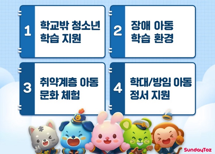 ... 이번 선정 행사는 네티즌 참여라는 이색적인 내용과 함께 아동 및 청소년에 대한 현안을 알리며 네티즌들의 관심사를 가늠할 기회가 될 것으로 관심을 모은다. 선데이토즈는 2018년부터 기부와 지원은 물론 이용자들의 참여가 더해진 참여형 사회공헌 활동을 진행하고 있다. 주요