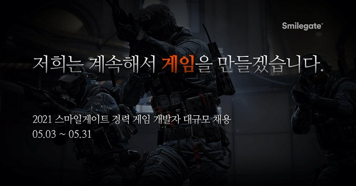 ... 채용 법인은 ▲스마일게이트 엔터테인먼트, ▲스마일게이트 메가포트, ▲스마일게이트 RPG 총 3개법인으로 ▲그래픽, ▲기획, ▲서버, ▲클라이언트, ▲PM(프로젝트 매니저) 등 개발 전분야에 걸쳐 모집한다. 특히, 5월 3일부터 31일까지는 집중 채용 기간으로 별도의 채용