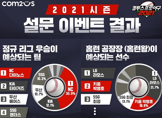 ... 약2만여 명의 ‘컴프야2021’ 유저들이 참여한 이번 시즌 정규리그 우승팀 전망에는 ‘NC다이노스’가 전체의30. 9%의 지지를 받으며 지난해에 이어 다시 한번 챔피언의 자리에 오를 것으로 예측했다. 실제로NC는 타 구단과 비교해